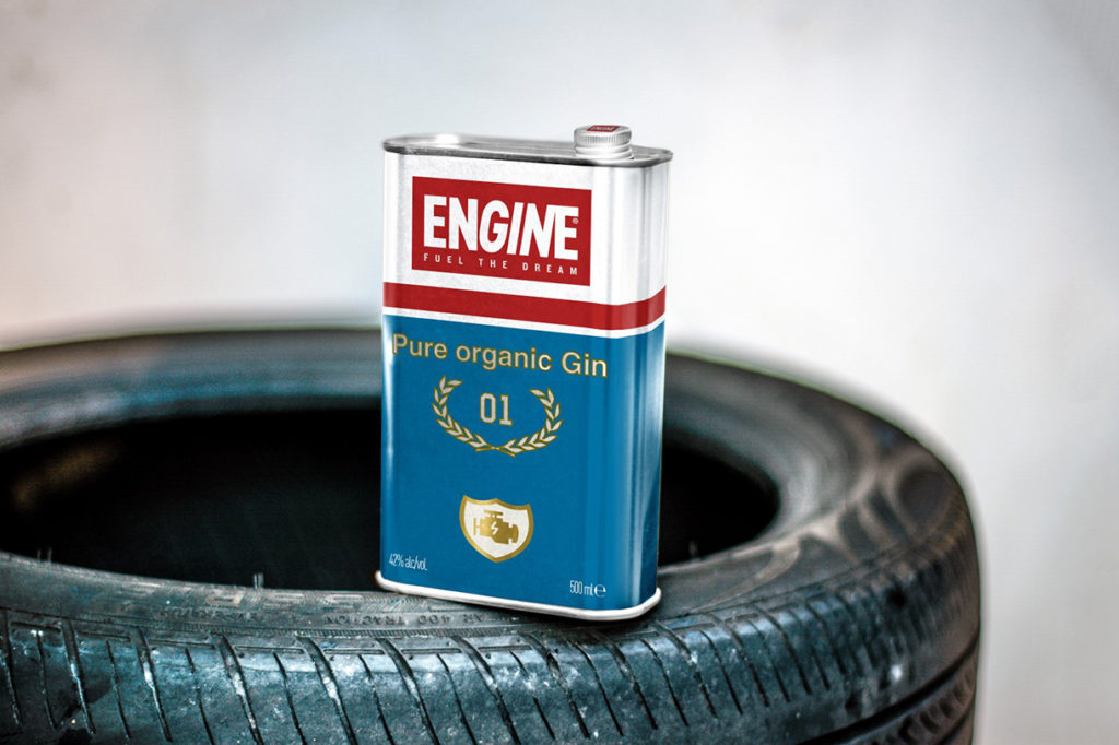 Quello che ci ha ulteriormente colpito e sorpreso è stato il packaging design. Siamo in officina negli anni ’70, nel parcheggio ci sono una Ford Mustang GT e una Dodge Charger 440 R/T appena riparate. Al cinema Steve McQueen indossa la sua tuta bianca e strisce rosse e blu di On Any Sunday (1971). Il sapore è quello, Il Gin è contenuto in una vera e propria tanica di latta (mezzo litro) con il tappo a vite come da tradizione del contenitore per l’olio delle macchine. Idea originale coniugata anche sul secchiello del ghiaccio e nei bicchieri in metallo presi realizzati come un barattolo.