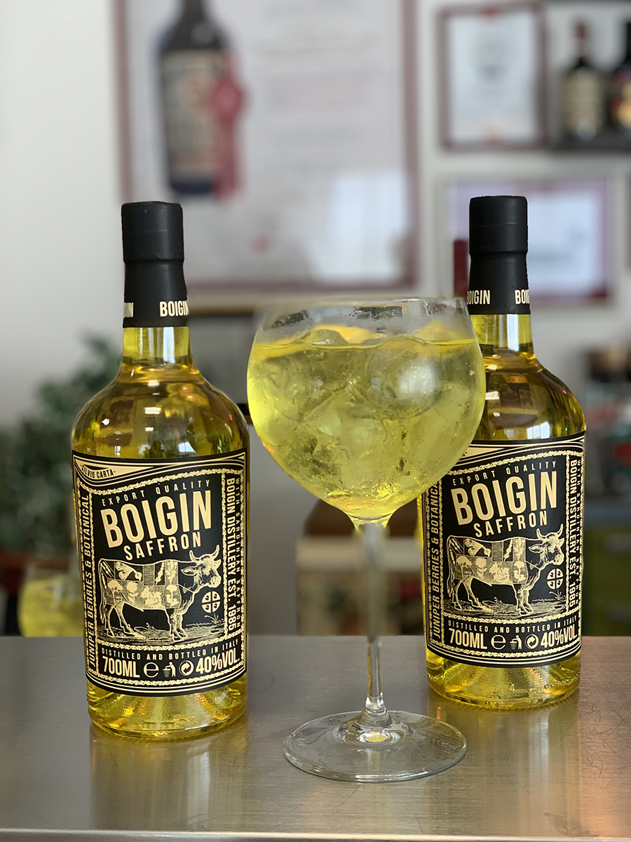 Passando al Giniu, il loro london dry che al naso, profuma (letteralmente) di Sardegna (anche nell’elegante versione 517) e porta con se quel profumo salmastro che ci ha colpito sin dal primo assaggio per la sua delicata persistenza, soprattutto bevuto in purezza e non in miscelazione (che ci sta comunque bene eh…). Il Boigin nella versione normal e Saffron (davvero ottimo) che nel suo colore giallo diventa invitante e perfetto per un Gin Tonic di gusto.