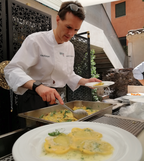 Lo chef che ha reso possibile tutto questo, con la sua partecipazione attiva e coinvolgente è stato Giuseppe Di Iorio, chef del ristorante AROMA di Palazzo Manfredi nella capitale.