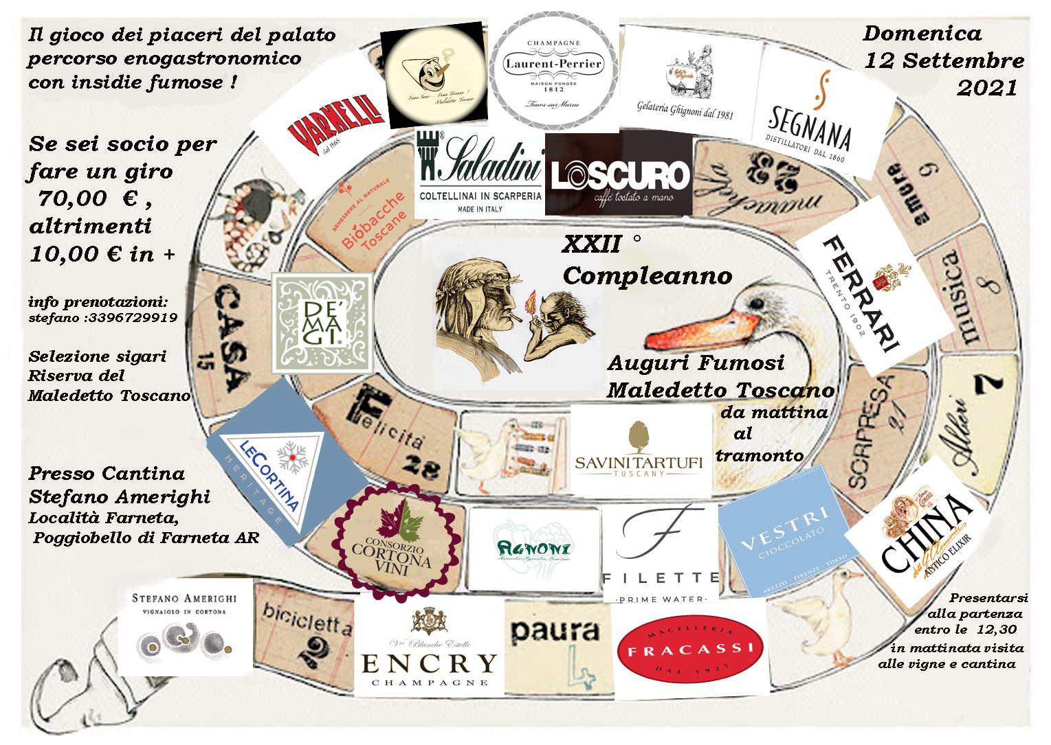 Sarà un vero e proprio Gioco dell’oca, con soste di eccellenze enogastronomiche; appuntamento a partire dalle ore 12.30, nelle campagne di Cortona fino al tardo pomeriggio. L’iniziativa, aperta a tutti su prenotazione, vedrà un punto di partenza e uno di arrivo. Ogni isola del “gioco dell’oca” ospiterà uno dei 18 partner dell’iniziativa che porteranno in degustazione le proprie eccellenze enogastronomiche, ma non solo. Il Club Maledetto Toscano festeggia così ventidue anni non solo di cultura del sigaro, ma anche di riflessioni sulla letteratura, sulla musica, sulla cultura. Una storia di promozione della “toscanità” e del Made in Italy del gusto e delle eccellenze, il tutto accompagnato da un grande prodotto riconosciuto per le proprie caratteristiche in tutto il mondo: il “Sigaro Toscano”.