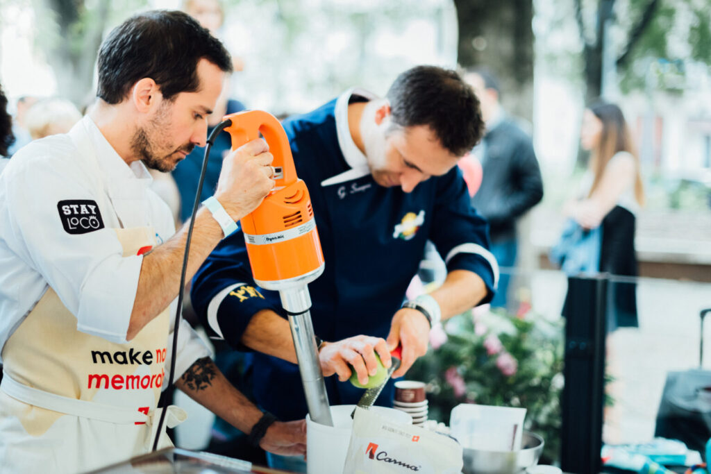 Dolce Incontro – Crema allo zafferano, limone e pistacchi pralinate - Sara Bellinzona – Finalista MasterChef Italia, con Stefano Cecconi di Cremeria Cecconi, Arezzo- Occhi di Ragazza – Crema allo zafferano di Mornico Losana, miele di Montalto Pavese e mandorle di Sicilia Pralinate