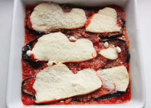 Oliate una pirofila 20×30 cm con un pennellino e poi cospargete un pò di sugo, adagiate le fette di melanzane sopra uno strato di sugo, poi di mozzarella o caciocavallo tagliato a fette o dadini, e infine una spolverata di parmigiano grattugiato.