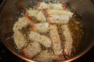 Preparate i crostini tagliando il pane a listarelle e fate tostare al forno per circa 10 minuti fino a doratura o friggeteli rapidamente.