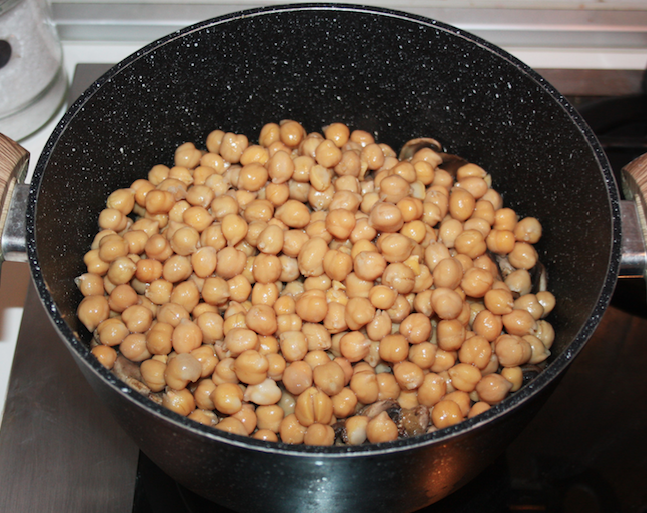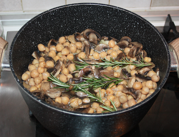 Mettete in ammollo i ceci e lessateli per 2 ore. Lavate e tagliate i funghi a fettine.Tritate finemente una cipolla media e fatela imbiondire con un po’ d’olio, aggiungete l’aglio e i funghi e rosolate per qualche minuto.