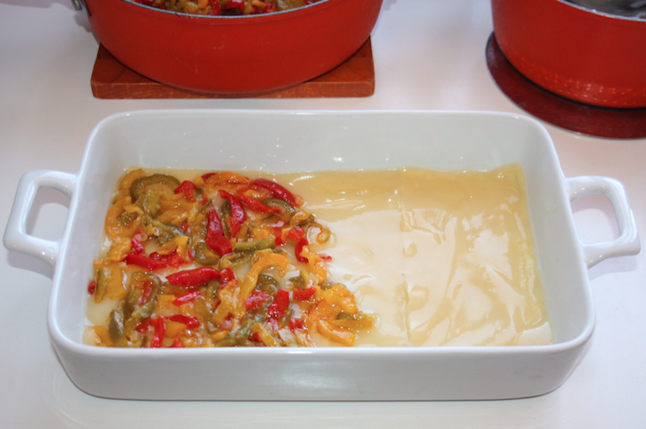 Lessate le lasagne in acqua salata, oliate la pirofila e mettete sul fondo uno strato uniforme di besciamella, stendete le sfoglie di lasagna e condite con un po’ di besciamella e di peperoni.