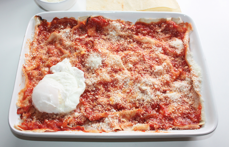 Condite con il sugo e il pecorino. Continuate finché non finite il pane. In un pentolino di acqua salata e bollente fate cuocere per tre minuti le uova in camicia. Sgusciatele e fatele scivolare delicatamente nell’acqua per evitare che si rompano e con una schiumarola mettetele sull’ultimo strato di pane e sugo.