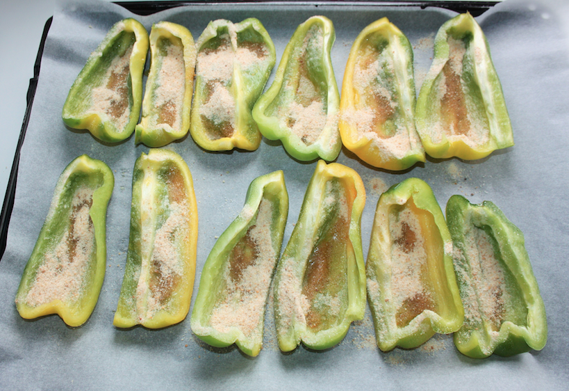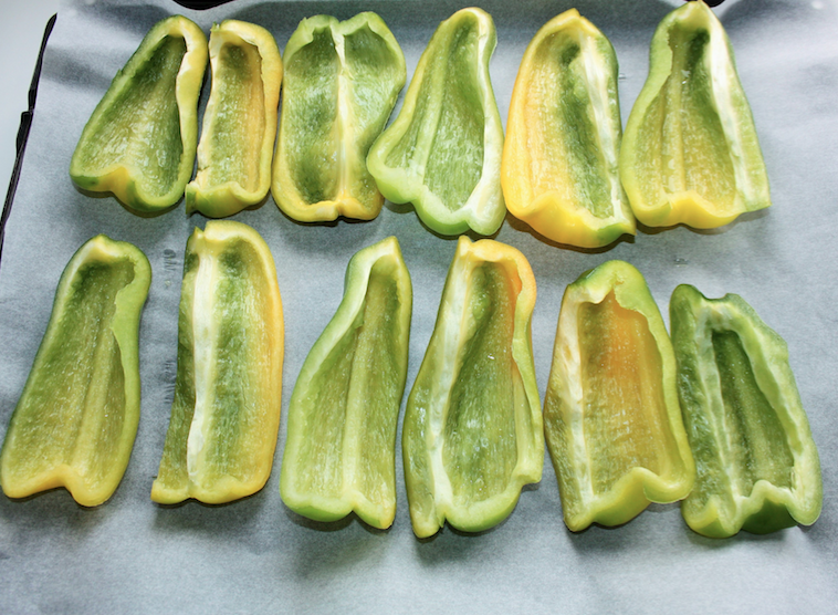 Pulite i peperoni privandoli dei semi, divideteli in quattro e sistemateli in una teglia  capiente.