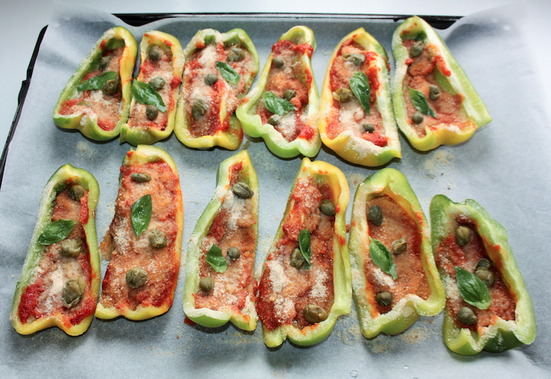 Aggiungete poi un cucchiaio di passata di pomodoro, altro pangrattato, tre/quattro capperi per fetta, qualche goccia di aceto e infine un filo d’olio e una fogliolina di basilico.