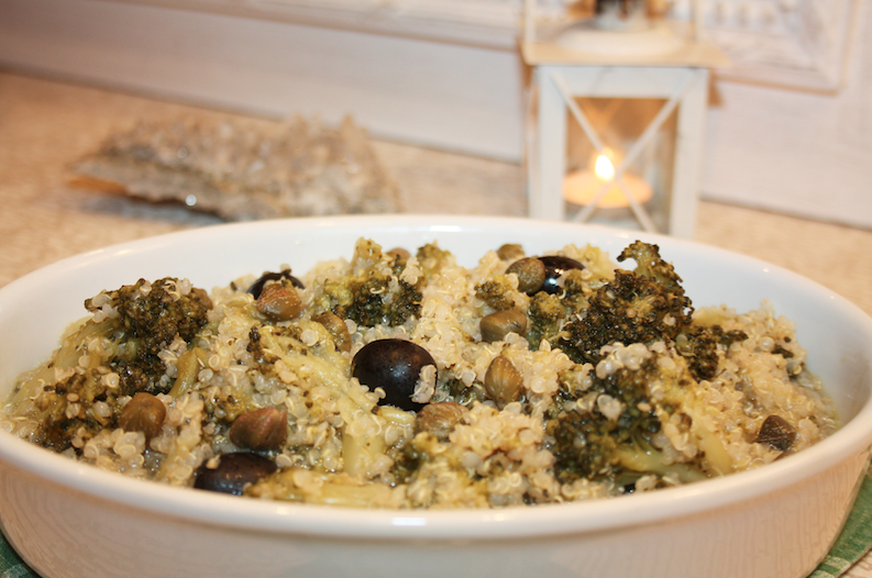 QUINOA CON BROCCOLI, CAPPERI E OLIVE (ricetta vegana).