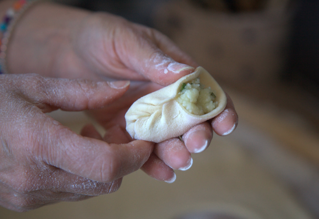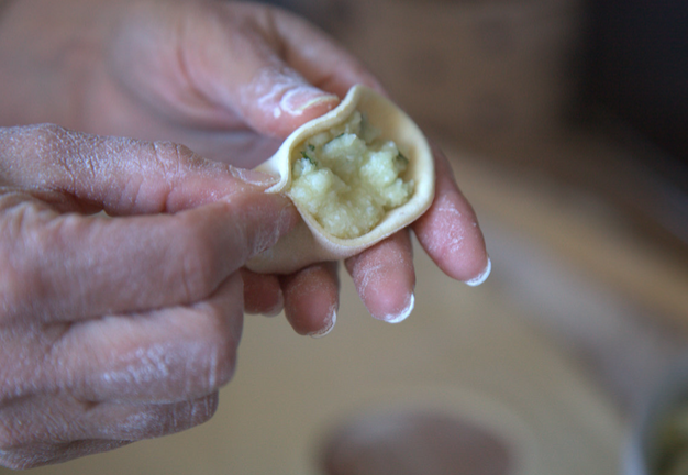 Al centro di ogni disco ho messo una porzione di purea di patate ed ho iniziato a chiudere i Culurgiones pizzicando e poi spingendo in dentro l’impasto fino alla fine lasciando una chiusura a forma di spiga ed ottenendo un raviolo a forma di goccia.