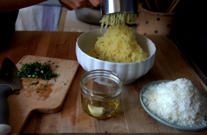 Ho tolto i due spicchi d’aglio dal barattolo e ho aggiunto l’olio rimanente alla purea di patate con i due pecorini grattugiati, l’aglio e la menta tritati e un pizzico di sale.
