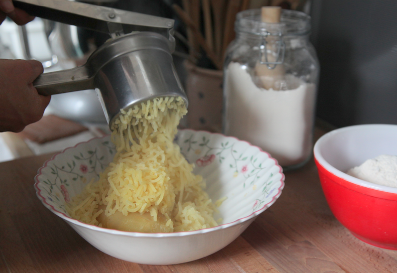 Ho fatto bollire le patate fino a farle diventare morbide, me ne sono accorta infilando uno spiedino; poi le ho passate a setaccio e, finché calde, ho aggiunto un tocchetto di burro e la farina.