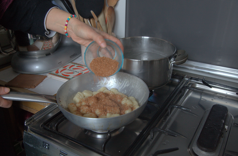 La signora Maria mi ha raccomandato di dare il giusto equilibrio alla combinazione di formaggio, zucchero e cannella, ingredienti che bisogna miscelare in precedenza in una ciotola da tenere da parte e aggiungere solo alla fine assieme al burro fuso. La dose di cannella può essere dosata a piacimento ma il Parmigiano deve avere lo stesso peso dello zucchero.