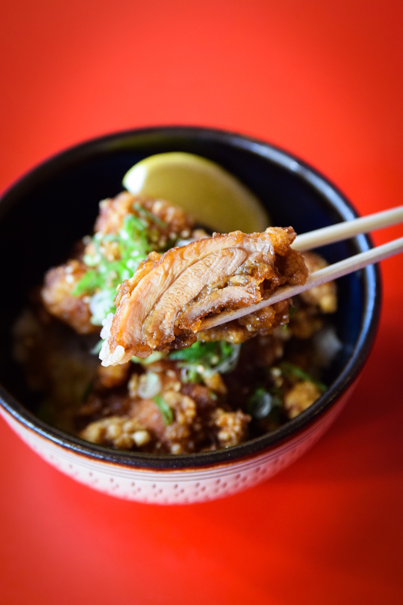 Prezzi: 8 € per la melanzana e 13€ per il pollo fritto servito con riso bianco di Niigata.