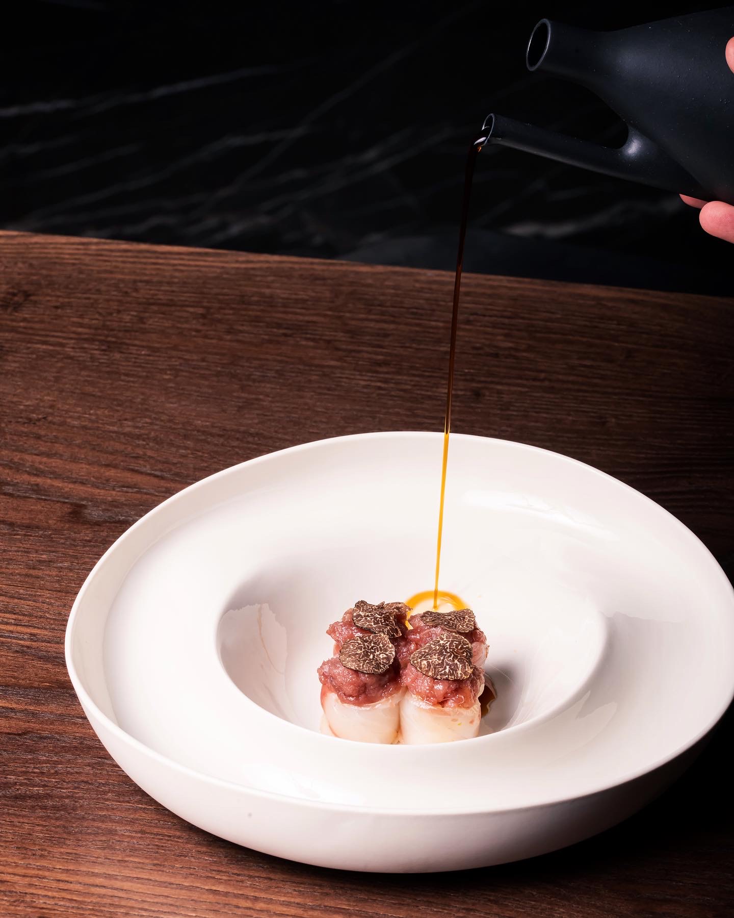 “Solo per questa stagione, al J di Napoli è possibile trovare una chicca gastronomica succulenta, che unisce il territorio, con la scelta del tartufo nero di Bagnoli Irpino, in provincia di Avellino, che si raccoglie da ottobre a marzo nelle tartufaie di montagna, sui monti Picentini, tra gli 800 e 1500 metri di altezza. Dal sentore molto intenso, questo tartufo si trova sotto piante come faggi, noccioli selvatici o pini neri, di forma irregolare, rotondeggiante e di dimensioni di un uovo o poco più. Il nome del piatto è Gunkan Special Truffle. Li chiamiamo gunkan Special perché all’esterno presentano filetti di pesce, differenziandosi dai gunkan classici i quali presentano all’esterno l’alga nori. Gli ingredienti sono riso, filetto di ricciola, tartare di ventresca di tonno, tartufo nero bagnolese, soia aromatizzata allo zenzero e wasabi. L’idea di questo piatto nasce dall’esigenza di utilizzare il tartufo di pezzature più piccole e gli ‘scarti della ventresca’, e dalla necessità di trovare un connubio tra prodotti d’élite della terra (tartufo) e quelli del mare (ventresca e ricciola), giocando con acidità e sapori intensi”.