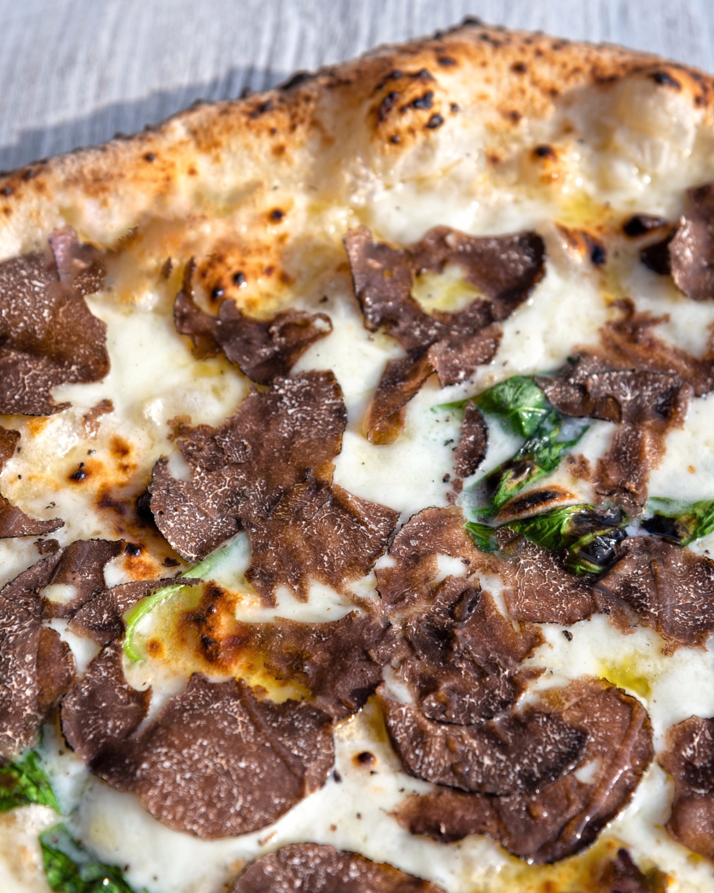 “Colori caldi, sfumature avvolgenti e profumi intensi sono i primi elementi che mi vengono in mente quando penso all’autunno. Da Pizzeria Salvo teniamo molto a rispettare la stagionalità degli ingredienti che utilizziamo come topping sulle nostre pizze e solitamente, durante questo periodo dell’anno, mi piace sempre proporre una pizza che abbia come protagonista il tartufo. Bufala e tartufo è infatti una delle nostre creazioni autunnali composta da pochi ingredienti ma molto decisi: tartufo nero invernale, bufala campana e un olio dal sapore molto robusto. L’idea è quella di prendere il tartufo che nello scenario collettivo rappresenta il prodotto nobile per eccellenza e abbinarlo a quello che è invece uno degli ingredienti nobili per eccellenza campani, la bufala, andando poi ad equilibrare i due elementi con l’aggiunta di un olio extravergine importante. Bufala e tartufo non manca mai nella carta autunnale perché da sempre mi piace l’idea che i miei ospiti possano assaporare il gusto intenso di questi ingredienti anche mentre mangiano una pizza. Ad accompagnare una portata così decisa mi piace sempre proporre un abbinamento tradizionale e uno un pochino più azzardato. Per il primo solitamente suggerisco un Aglianico, quello che da molti viene definito il Nebbiolo del sud, non troppo vecchio , così che abbia una sua tannicità, che sa sposarsi bene con il tartufo locale che arriva dal casertano, dal beneventano o dall’Irpinia, tutti comuni da trovare. Per l’abbinamento insolito mi sposterei invece sul vigneto autoctono piemontese Ruchè che ho da poco scoperto e di cui se ne parla poco pur essendo a mio parere degno di nota; alcuni produttori si stanno specializzando e lo stanno riscoprendo perché è considerato come un “Negramaro del Nord” nel gusto e nell’olfatto”.