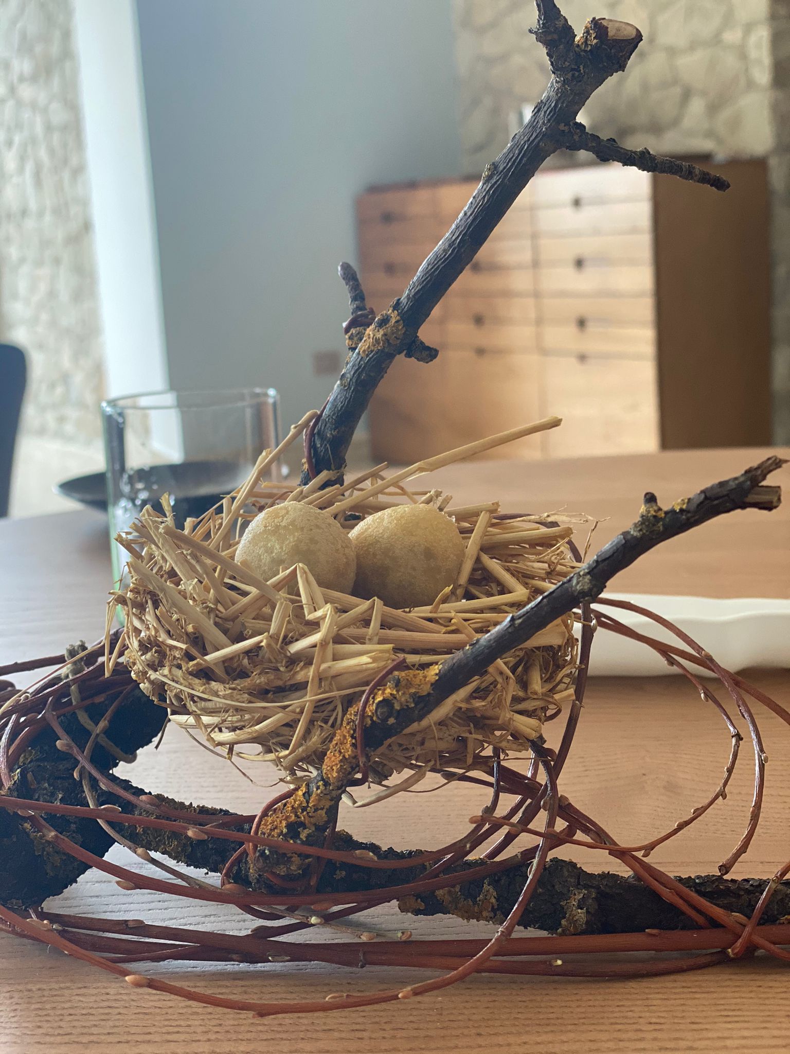 “Per me il tartufo è più che un ingrediente amato, è una materia prima che adoro e uso solo ed esclusivamente il tartufo bianco di Alba, di cui sono ambasciatore nel mondo. A lui ho dedicato un mio piatto storico, l’Uovo in tempura con tartufo che serviamo in questo nido che rappresenta proprio quello degli uccelli, con le uova fritte dentro. Per me questo piatto è l’apoteosi dell’autunno, proprio perché il tartufo inizia i primi ottobre e finisce a gennaio, ma con la neve poi non si va più a raccoglierlo, perché i cani lasciano le impronte… Le uova sono quelle delle mie galline, che razzolano in cortile, dietro al Krèsios. A questo piatto abbinerei lo Champagne, ma invece Alfredo, il sommelier del Krèsios, non credo sia d’accordo, oppure un kombucha al pomodoro.” A Iannotti risponde pronto Alfredo Buonanno, che conferma kombucha come abbinamento inusuale, ma non al pomodoro, bensì alla mela cotogna. “La piacevole pungenza delle bollicine e del tipico carattere della kombucha, arricchito dalla dolcezza aromatica della mela cotogna, bilanciano l’energia dell’uovo al tartufo bianco. Se invece dovessi optare per un abbinamento più classico, allora direi un Ognostro Bianco 2019 di Marco Tinessa. Il tartufo bianco d’Alba incontra l’uovo e l’uovo al tartufo incontra il Fiano di Tinessa. Grazie alla generosità dei profumi del vino e alla ricchezza in bocca, sia in termini di esplosività che di persistenza, l’inconfondibile carattere del tartufo e dell’uovo trova un degno compagno di viaggio regalando al palato un’armonia di dolcezza, cremosità, freschezza e sapidità.”
