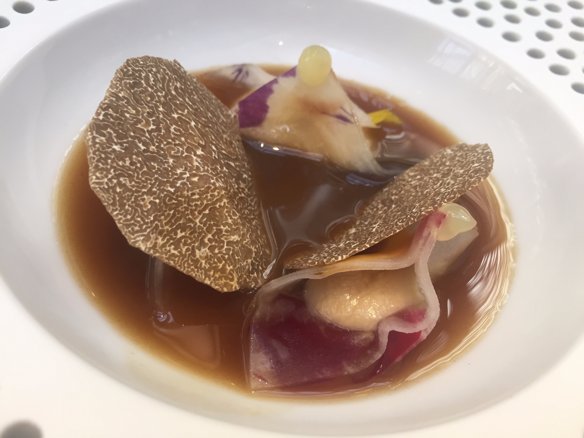 La rapa in questione è la “brovada”, prodotto friulano che viene tradizionalmente fatto fermentare nelle vinacce per almeno 40 giorni, dopo la vendemmia, e che viene tagliato molto sottilmente, si condisce con un pizzico di sale e due gocce d’olio e viene servita con miso d’orzo, tartufo nero e finita con un brodo concentrato fatto anche con le bucce in cui si esalta tutta la parte sapida dell’ortaggio. Per finire, dei petali di fiore, incastonati come in un piccolo puzzle, sopra un’altra lamina di rapa e si chiude sottovuoto, per una leggera osmosi: il risultato è un quadro gastronomico colorato, una cartolina floreale. “Io facevo la mia brovada con l’uva fragolina, – ricorda Scarello – perché portava una nota più rotonda, più fruttata, ma col tempo mi sono accorto che quando si usa della vinaccia da uva rossa, il carattere è molto spinto e mi piace di più.” Get Green è un nuovo progetto firmato dallo chef di Godia, che ha sviluppato il precedente menù vegetale, il Go Green, utilizzando un’ottica e una cucina che va oltre il vegetariano per arrivare alla realizzazione di sorprendenti piatti vegani frutto di una grande ricerca in cucina e tra le materie prime territoriali. In abbinamento ai Tortelli, il sommelier Iacopo Gerussi ha scelto un Savagnin in purezza, del Domaine de Montbourgeau, L’Etoile, vino longevo frutto di vendemmia tardiva e barrique. Qui la lunghezza del vino e la sua sapidità giocano con l’intensità del piatto, in particolare del brodo concentrato, mentre il leggero sentore affumicato del naso amplifica il vegetale della brovada.