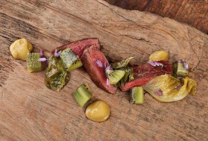 Tagliare il manzo e posizionarlo nel piatto, aggiungendo ogni pezzo del sale maldon Sistemare la lattuga marinata ed i cubi di kiwi