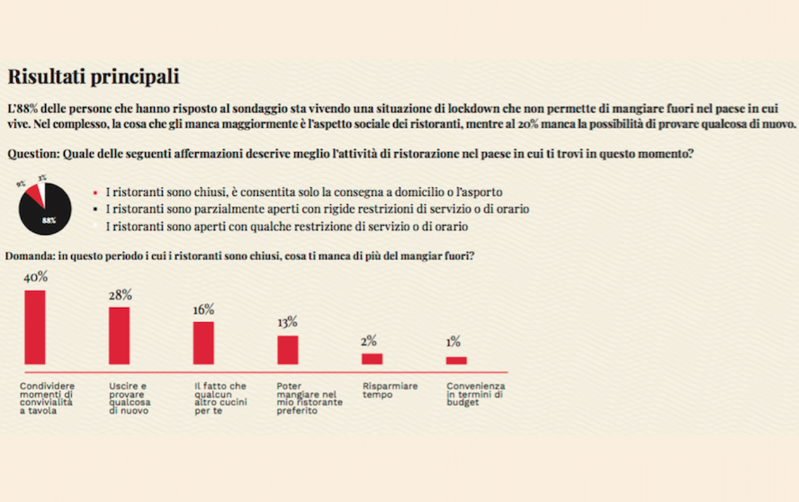 Ai consumatori manca decisamente l’esperienza di un pasto fuoricasa: il 40% in particolare ha nostalgia delle implicazioni sociali che un pranzo o una cena al ristorante comportano, molto più che del puro piacere della novità o della scoperta legata all’esperienza del cibo.