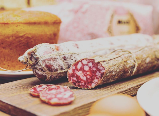 Antipasti: corallina puro suino brado, salame artigianale abruzzese, torta al formaggio