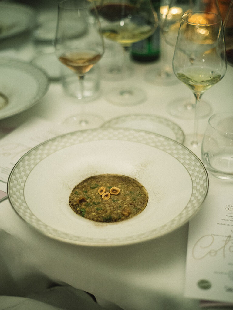 Il ricco menu della cena a 6 mani ha visto il Morbido allo zafferano, caviale di senape e oro di Carlo Cracco, la Tartare di Coregone di Norbert Niederkofler, quindi l’Orzotto con funghi, nocciole e garum di lievito in polvere di Ana Roš. Quindi, il Salmerino in crosta, ancora di Carlo Cracco, e per finire la Linzer di Niederkofler e il Dolce natalizio di Cracco. Ogni piatto è stato accompagnato dai vini Cotarella, Sorèlle 2022, Il Punto 2021 IGP Lazio, Brunello di Montalcino 2018 DOCG Le Macioche, Montiano 2020 IGP Lazio e, in conclusione, Passirò 2021 IGP Lazio.