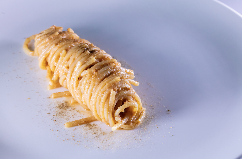 I primi si differenziano sia nella forma della pasta utilizzata, che nell’uso degli ingredienti e l’accostamento dei sapori. Plin robiola, estratto di cipolla e chiodi di garofano, una pasta ripiena con una fresca crema di robiola unita a un estratto di cipolle cotte sul barbecue e una gelatina di chiodi di garofano; spaghetto cozze, capperi e limone, è il piatto dell’estate, servito freddo, ci si ritrova in riva al mare con una crema di cozze a far da complemento alla polvere di capperi e limone; tortello capretto, pistacchio e castelmagno, dove la tenera carne di capra, il croccante pistacchio e il morbido formaggio si fondono in un perfetto equilibrio dei sapori e panzerotto con galletto affumicato, pomodoro, olive e maggiorana: al ripieno goloso e intenso si accosta l’aromaticità e l’acidità del pomodoro, la tenerezza delle olive e la maggiorana.