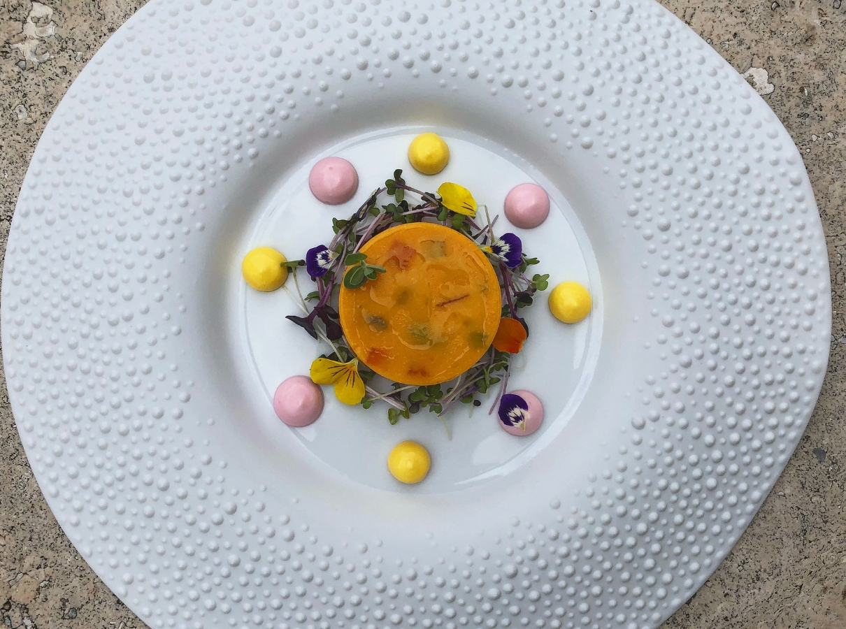 Cominciamo con un antipasto: La passeggiata nel bosco. Si tratta di una terrina di verdure con teneri germogli e maionese senza uovo, alla barbabietola e allo zafferano. Un piatto che nasce dal mio amore per il colore. La mia cucina infatti cerca di essere sempre vivace e il mio desidero è quello di far risaltare il colore delle verdure che sono bellissime di natura.