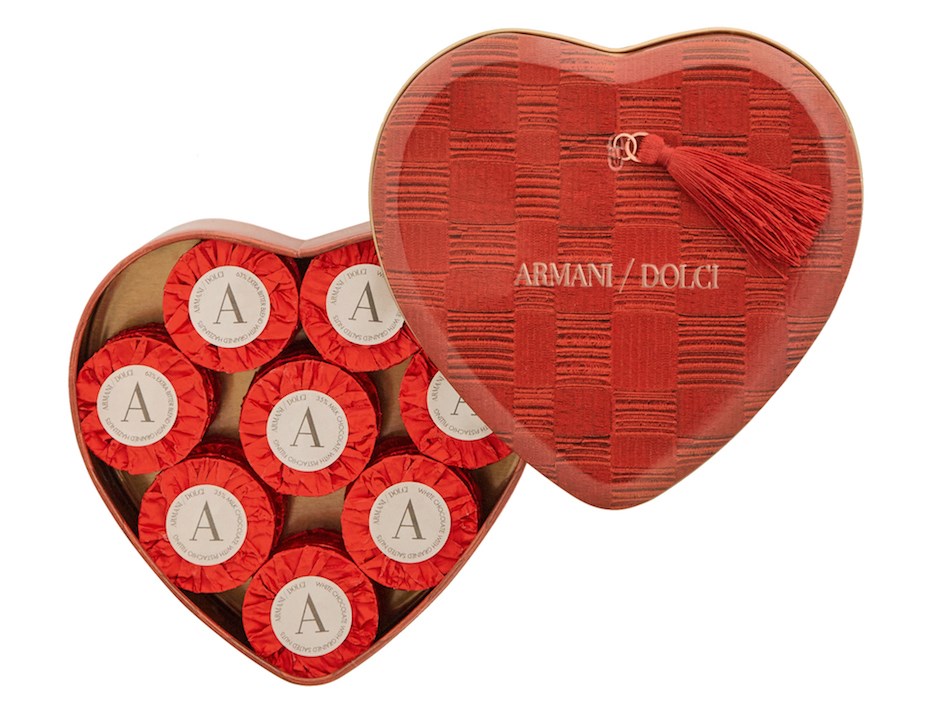 - Armani/Dolci by Guido Gobino celebra il San Valentino 2020 con una nuova pralina al latte con ripieno di pistacchio e tre mini cialde ai gusti cioccolato bianco e frutta secca salata, latte e pistacchio e fondente 63% con nocciole. Il tocco in più è il packaging, realizzato con un rosso intenso ispirato alla trama del tessuto Jaasan della collezione Armani/Casa, con il logo Armani/Dolci in oro lucido.