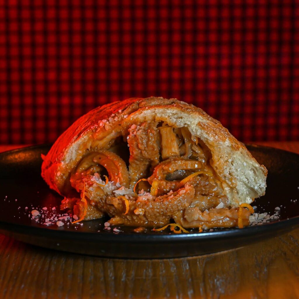 Utilizzo solo farine Molino Casillo, di cui sono anche Pizza ambassador. Il nostro pane signature è sicuramente la ciabatta: 100% semola di grano duro rimacinata, impasto con la biga che presenta un’idratazione del 90% e 24h di lievitazione con lievito madre. Lo tagliamo in obliquo creando una tasca e proponiamo diverse farciture: Ragù bianco di pecora (preparato con soffritto classico e carne di pecora battuta a coltello, allungato con il suo fondo e cotto per circa 4 ore), pecorino d’Aspromonte grattugiato e menta, oppure con Interiora di cuore, polmone e trippa, scorzetta di arancia e pecorino d’Aspromonte, o anche (per i vegani) con Peperoni e patate soffritti secondo un’antica ricetta povera calabrese e conditi con una crema di pomodoro bruciato.