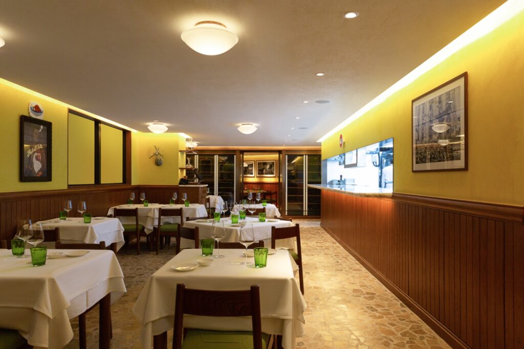 Infine, gli interni (curati dal designer Sean Dix) rétro rendono omaggio alle trattorie milanesi degli anni ’70 con un tocco chic; sono ben accostati le pareti color giallo senape, i mobili verde oliva e il pavimento palladiana; deliziosa la saletta privata, dove cenare in assoluta riservatezza. Alle pareti, con lo scopo di portare un po’ di italianità ad Hong Kong, troviamo fotografie di Milano in bianco e nero firmate dalla fotografa Martina Leo e quadri pop art di Matteo Benassi.