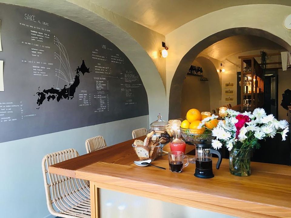 Chiusa la porta alle nostre spalle, lasciamo all’esterno i rumori tipici della piazza e del mercato, per immergerci in un ambiente di relax, grazia e freschezza. Il locale è stretto ma confortevole, si sviluppa in lunghezza. Al centro un bancone di legno chiaro, sul quale si consumano i pasti, separa l’aria bar e la sala da lavoro dal resto del locale. Entrando, sulla parete di sinistra, difronte al bar, troviamo raffigurata una simpatica cartina geografica del Giappone affiancata dal menu, scritto direttamente su parete.