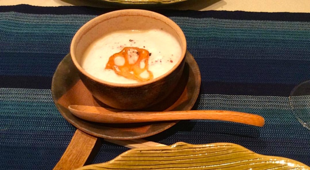 Con la zuppa di grano saraceno di Iya si può assaporare il pesce dell’indago giapponese cucinato con lo stile di cucina di questa antica area proprio a base di verdure e sobagome. La sobagome zosui è una sorta di zuppetta con riso, carne o pesce, condita con miso o salsa di soia e si mangia in tutto il Giappone. Il piatto nacque proprio nella zona di Iya un paese di Tokushima, circondato da montagne dove si produce poco riso, quindi qui si realizza con il grano saraceno invece del riso. Stranamente la zuppa è stata servita dopo il dessert, eppure ha riscosso un particolare successo e gradimento.