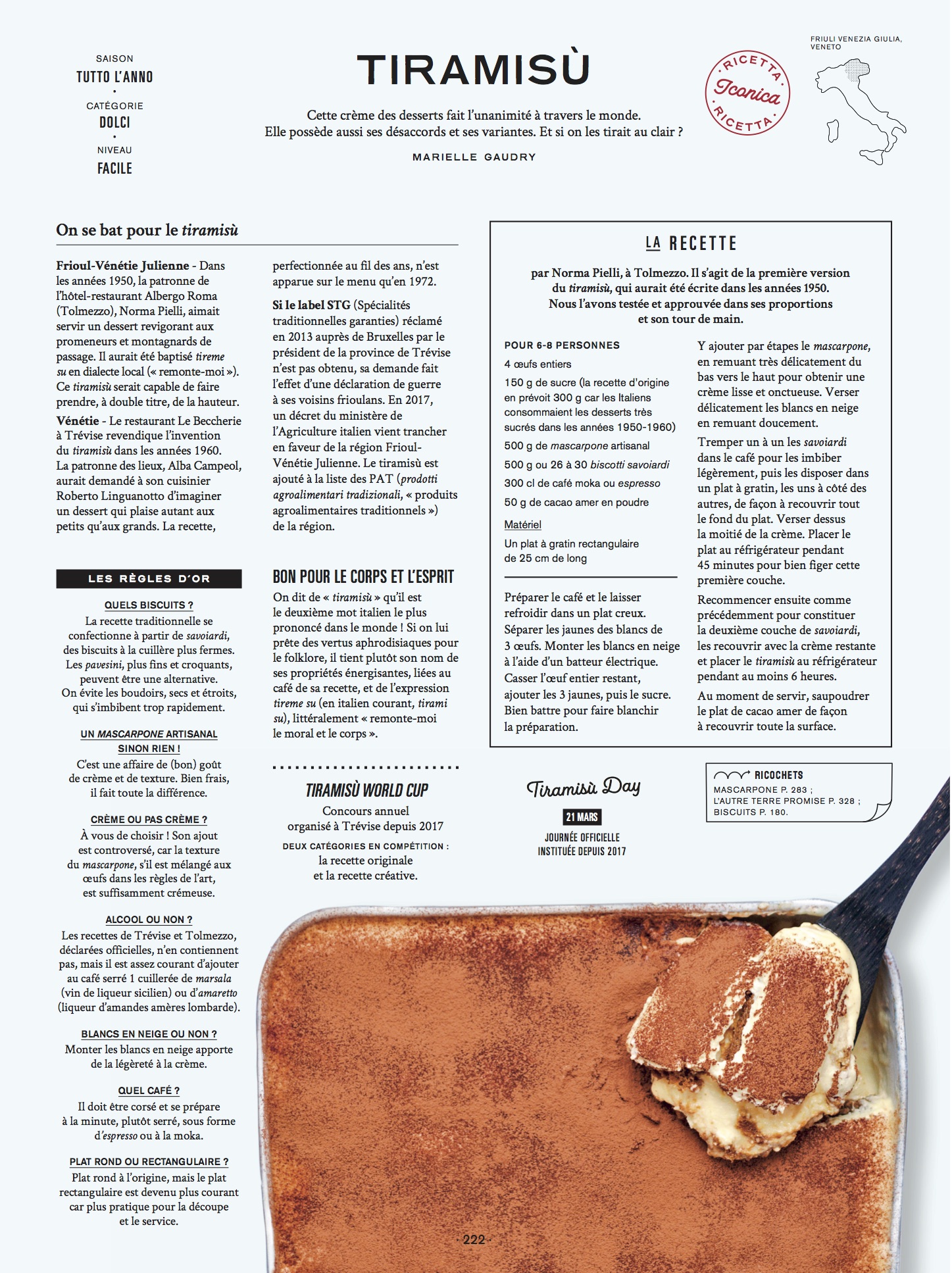 Per parlare di menu (c’è anche quello afrodisiaco di Casanova) e di ricette (sono 265 e c’è persino quella del panettone) scendono in campo chef e amici, oltre allo stesso François-Régis, noto al pubblico francese per la sua seguitissima trasmissione radiofonica On va dégusterche in 10 anni ha raggiunto ascolti da record ed è finita in libreria con tre titoli, l’ultimo dei quali è dedicato a l’Italie. Un volume che è un vero viaggio fra 1272 schede di prodotto e 350 argomenti legati alla tavola tra cui c’è spazio per ritratti di personaggi storici, aneddoti, libri, film e con un indice e una bibliografia da far invidia a un saggio.