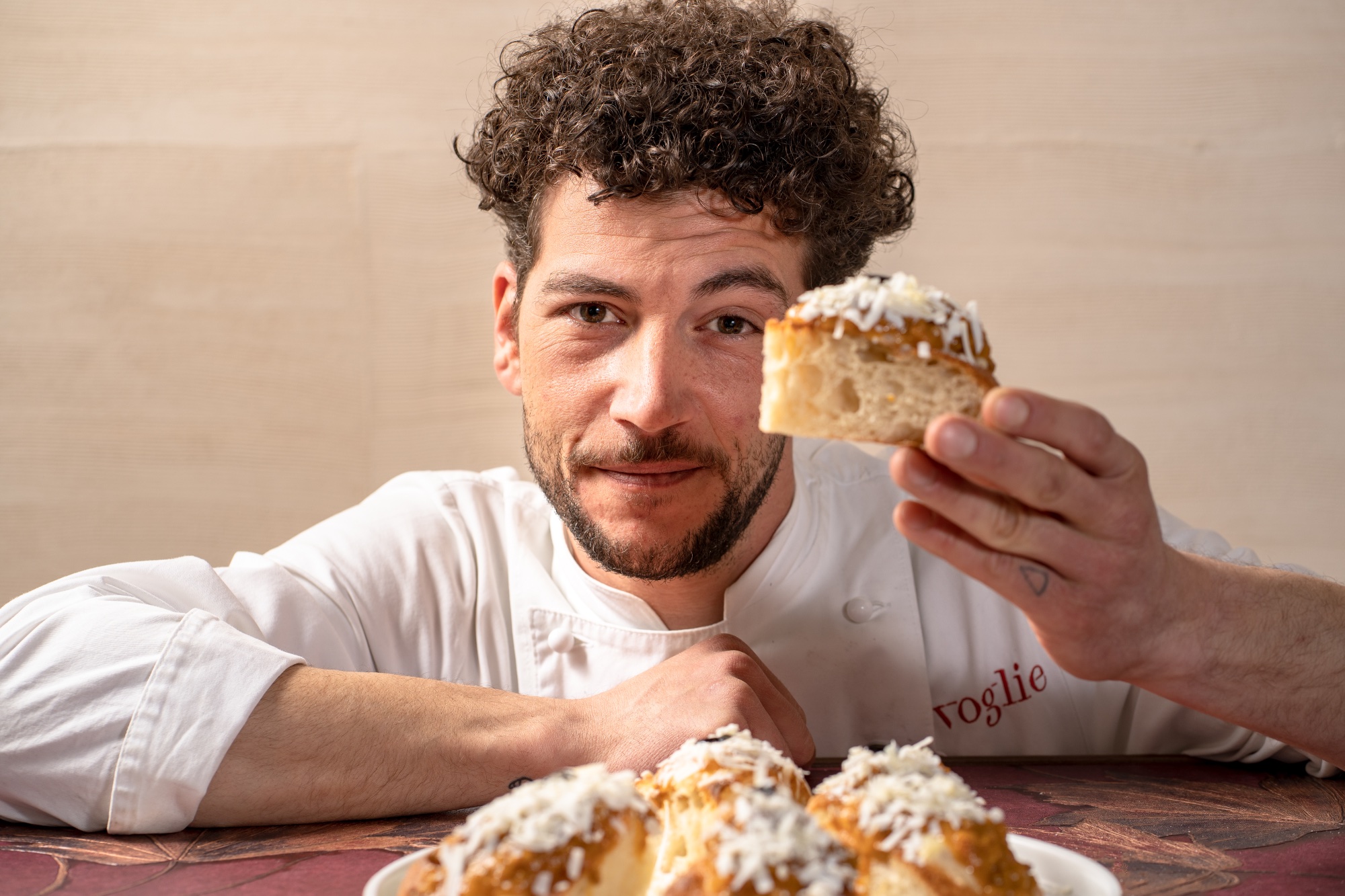 La pizza. Si tratta di un prodotto che nasce da un impasto realizzato con lievito madre, prima cotto in forno e poi impanato e fritto, un passaggio fondamentale per far mantenere la forma. All’interno si trovano fontina, del cotto alla brace e dei funghi marinati nel brodo vegetale e nella salsa di soia.