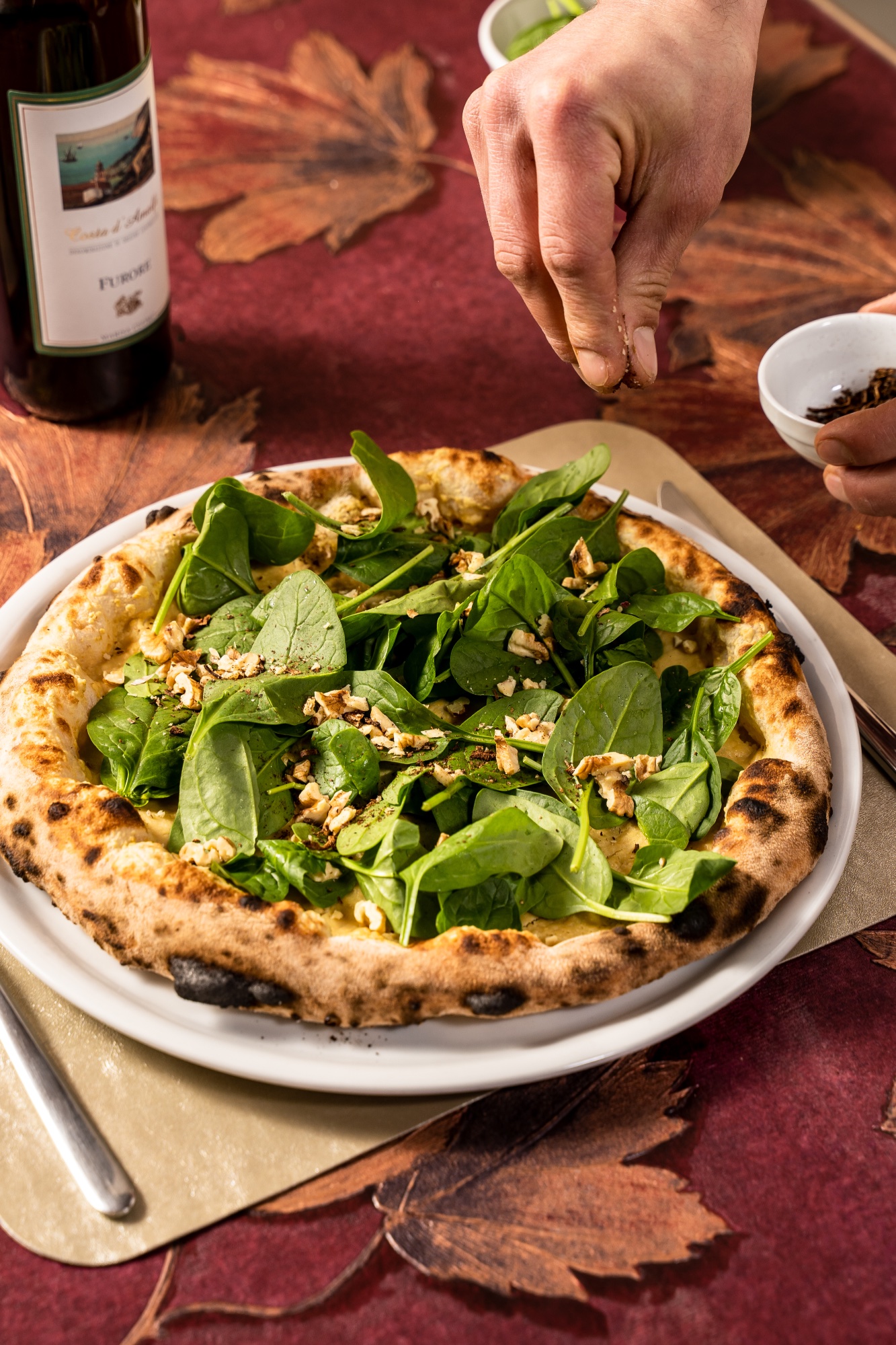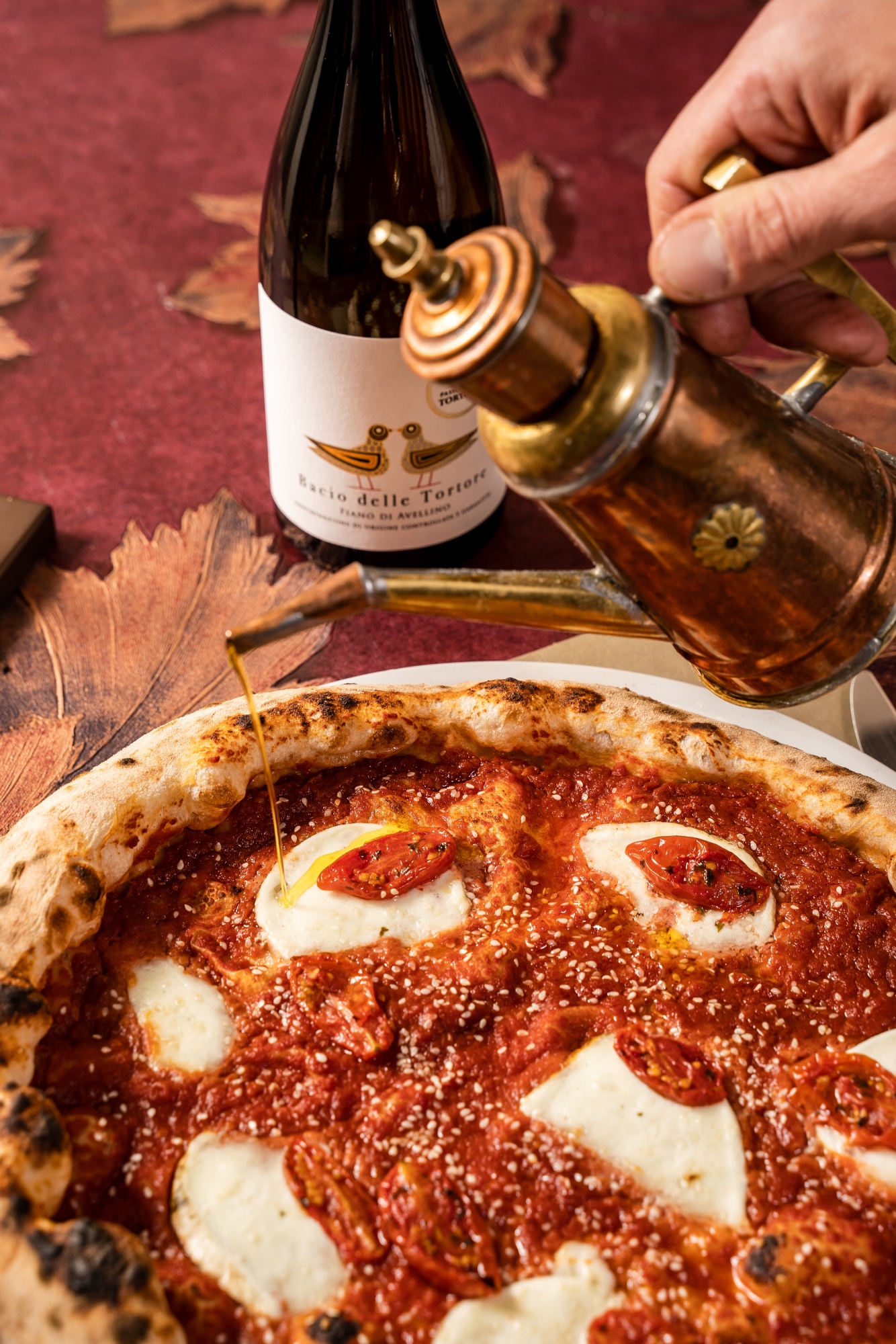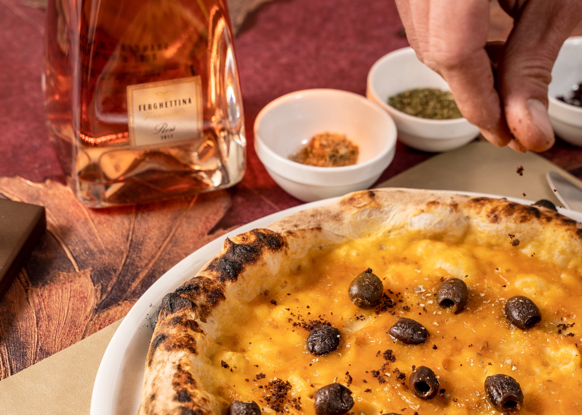 Il consiglio dell’enologo: “È una pizza ricca, in cui la morbidezza va a contrastare l’acidità. Ci sono la spigolosità dell’oliva e del cappero. Il Primitivo è un vino morbido che equilibra”.